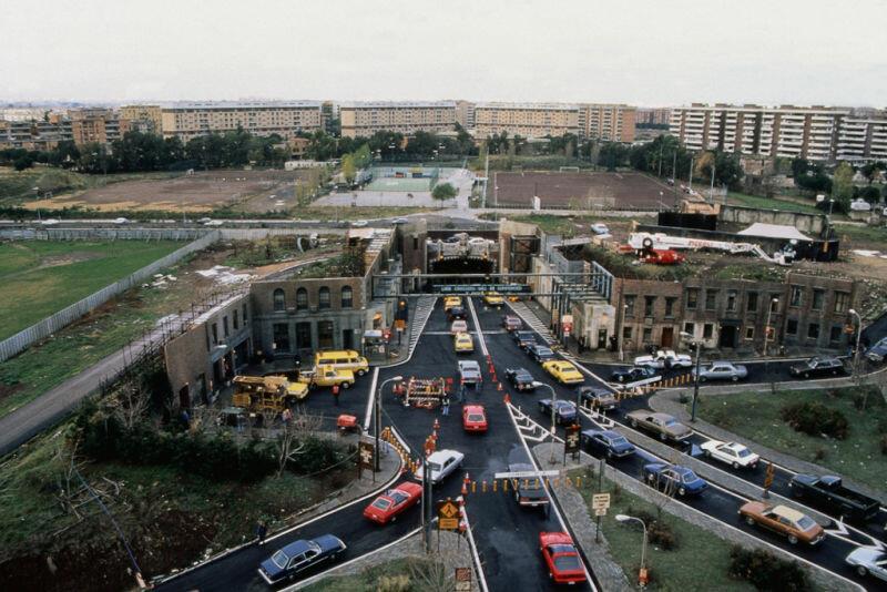 Ну вы понимаете, для взрыва их вставляем в кадр, а так нафиг не нужны. Почему так выходит? Все дело в месте съемок. Тоннель Холланд — это один из трех важнейших дорожных узлов, что соединяют Нью-Джерси и Манхеттан. Как бы власти города не были лояльны к киношникам, перекрывать его для съемок никто не будет! Это не окупится и нанесет больше вреда, чем пользы. Оттого съемки были комбинированные, потому и все эти косяки. Вот декорации въезда в тоннель.