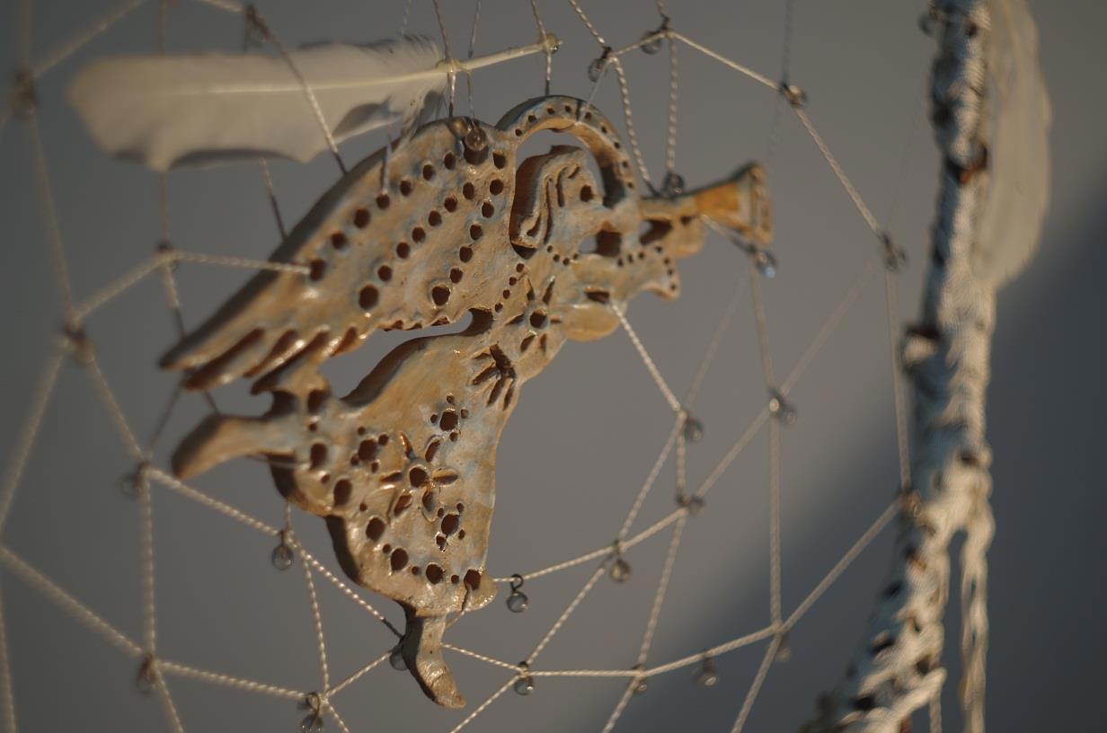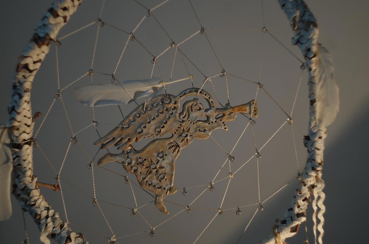 Посылочка от нас в Россию шла почти месяц и в дороге её чуть-чуть не угробили помяли, так что Лилии пришлось восстанавливать ободок Ловца Снов, но, ничего, главное что керамический ангел, запутавшийся в нитях Ловца не разбился - за это я особо переживала.