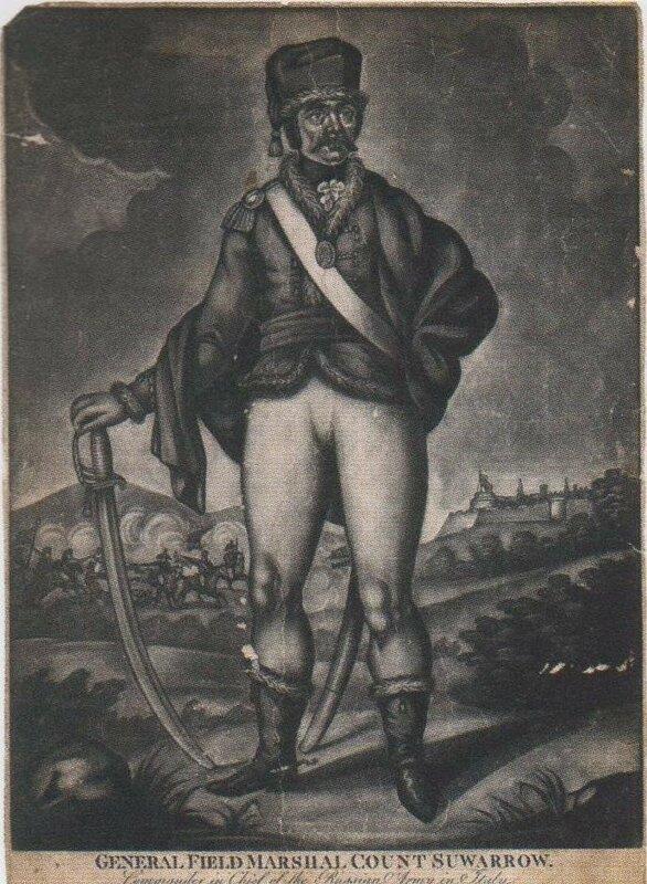 Впрочем, возможен и вариант, что прототипом и самой карикатуры, и этих портретов был вот этот "портрет" Суворова:
