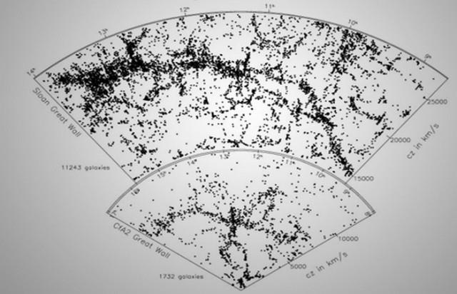 Ученые считают, что распределение материи во Вселенной не является случайным. Было высказано предположение, что галактики организованы в огромную универсальную структуру в виде нитевидных волокон или скоплений "перегородок" между огромными пустотами. Геометрически структура Вселенной больше всего напоминает пузырчатую массу или соты. Внутри сот, размер которых составляет примерно 100 миллионов световых лет, практически отсутствуют звезды и какая-либо материя. Такая структура был