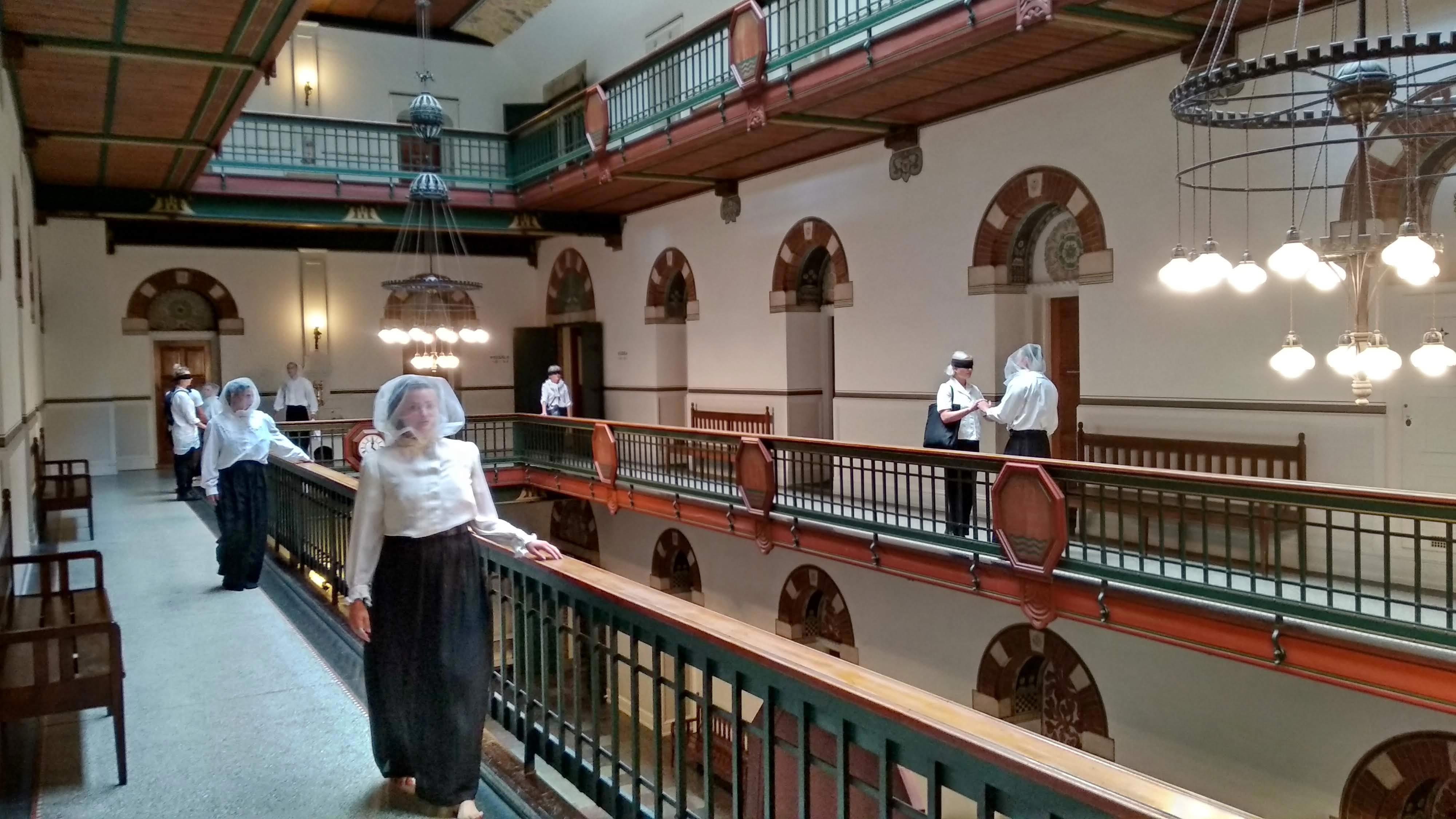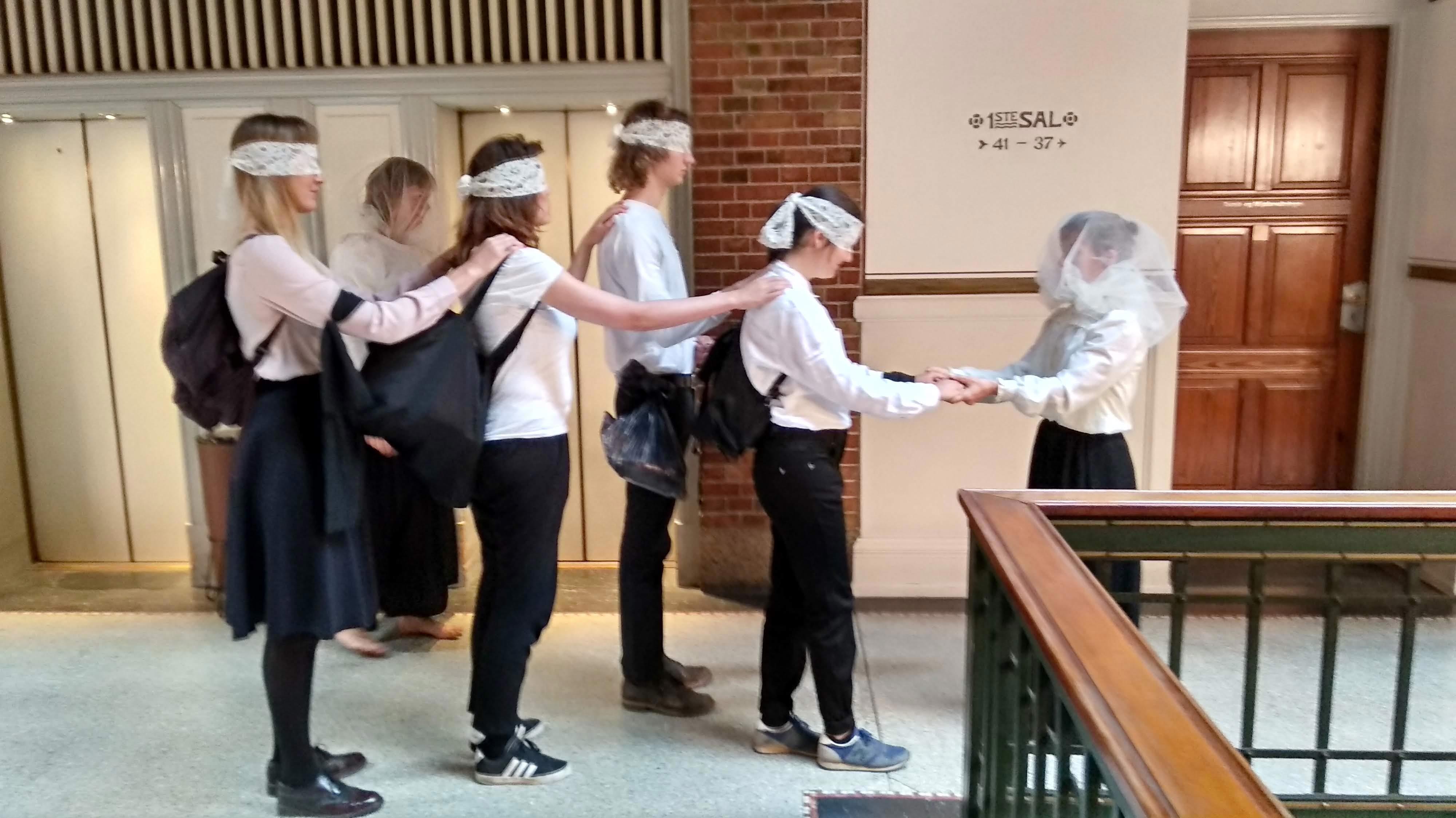 Их становилось всё больше и больше. В помещении была полная тишина и они, как призраки, медленно ходили по всем этажам, касаясь ладонями друг друга. Добавлю маленькую деталь, чтобы вы поняли, насколько мне взорвало мозг. Дания - очень современная страна и в ней в таких вот местах все двери открываются и закрываются автоматически. Просто представьте себе: вы подходите к массивной готической двери и она сама открывается. Вы заходите и видите медленно идущих людей с завязанными глазами, а дверь за вами сама закрывается. Все бесшумно.