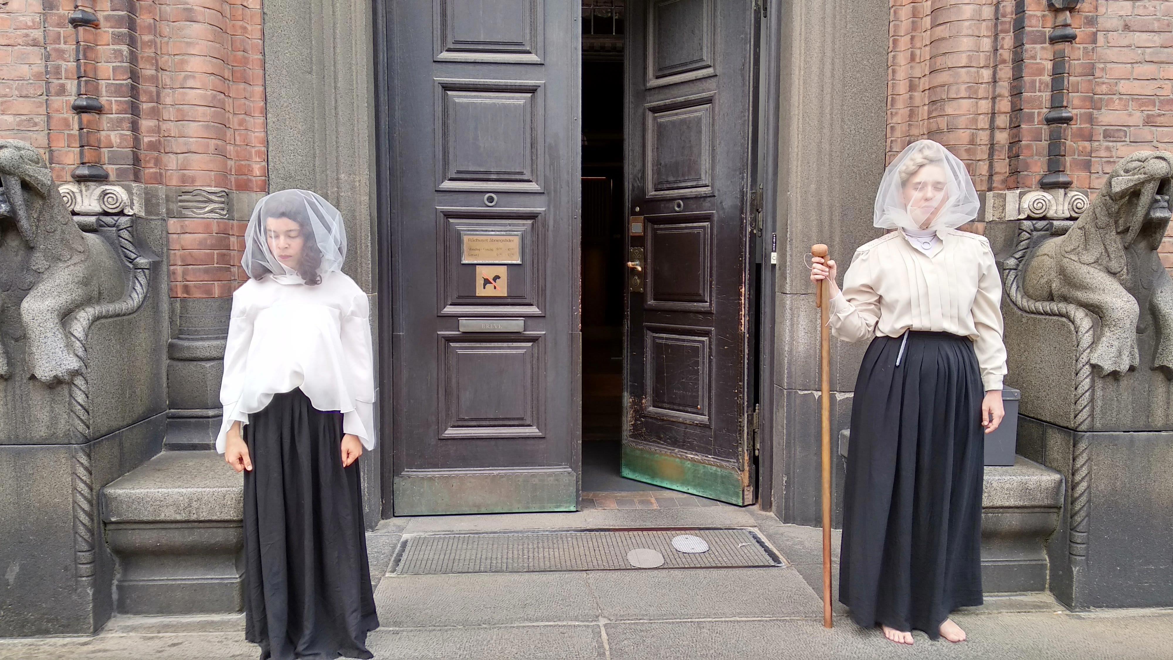 В конце концов, мы пошли к выходу. Дверь на улицу также сама открылась, мы вышли и обнаружили, что у входа стоят две девушки в белых вуалях. Одна с жезлом в руке. Когда я с выпученными глазами стал их снимать, та,что с жезлом почти засмеялась, потом подавила смех и специально для меня сделала драматическое выражение лица. Дверь сама закрылась.