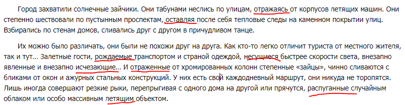 Город захватили солнечные зайчики. Одни, словно стаи птиц, носились по городу. Отражались от корпусов авиакаров и окон домов. Другие, степенные и неторопливые, важно пересекали улицы. Они оставляли за собой тепловые следы, а умный камень менял цвет. Фантастическое зрелище! И все эти блики, в какой то момент, взбирались по стены домов. И там, в вышине, они кружились в последнем танце, чтобы стать теплым летним утром.