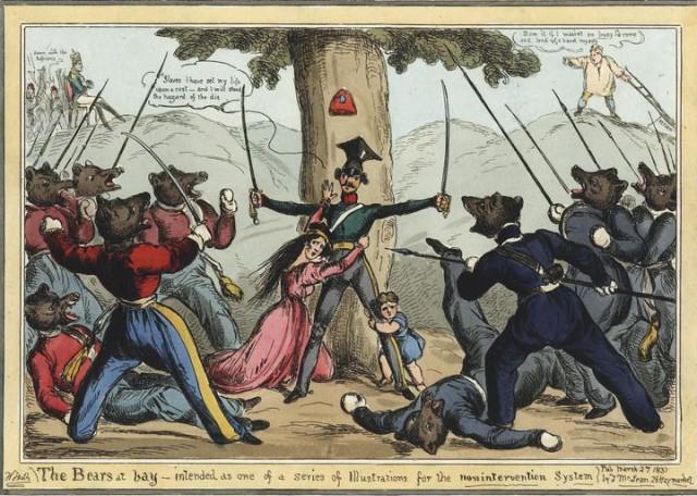 Подавление польского восстания 1830 года. Польский офицер принимает неравный бой против целой армии медведей. Он защищает женщину и ребёнка от варваров. Над головой фригийский колпак- символ свободы. Русские медведи вновь изображены в казацких одеждах. Во Франции родилась поговорка: «Поскребите русского, и вы обнаружите казака, поскребите казака, и вы обнаружите медведя…».