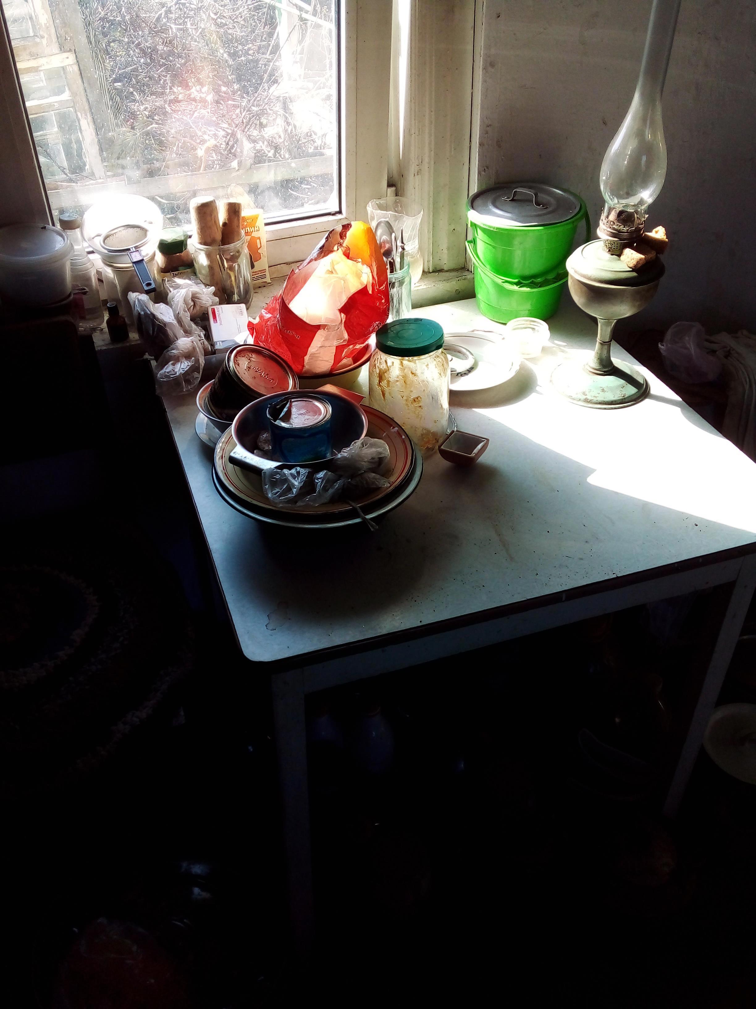 Стол около печи. Под ним нашлось множество пустых блистеров из-под таблеток — ими бабуля плотно закинулась в момент помрачения.