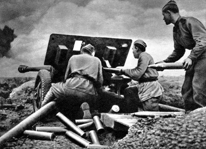 Расчет ИПТАПа ведет огонь прямой наводкой. ЗиС-3