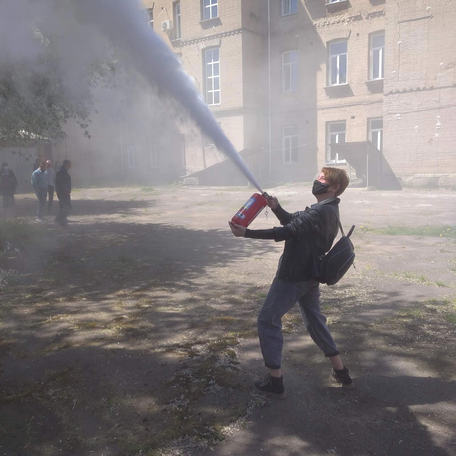 Завхоз всякий год объясняет, как пользоваться огнетушителем. Кому-то нетерпеливому уже неймётся...