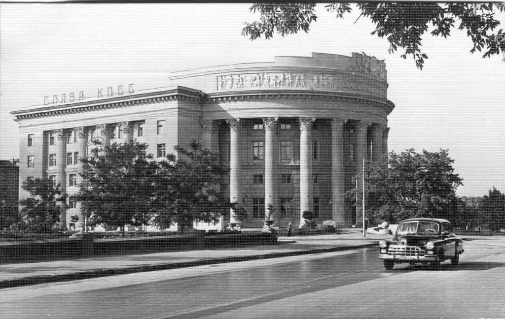 По сути, это не одно, а три здания с общим двором - очень оригинальный проект Вадима Масляева - одного из плеяды великих архитекторов, создавших послевоенное лицо центра Города. Фотографии разных лет. Пятидесятые-шестидесятые годы двадцатого века - рядом ещё нет высотных домов, построенных в конце шестидесятых-начале семидесятых: ни "Пионера" слева, ни "Современника" справа: