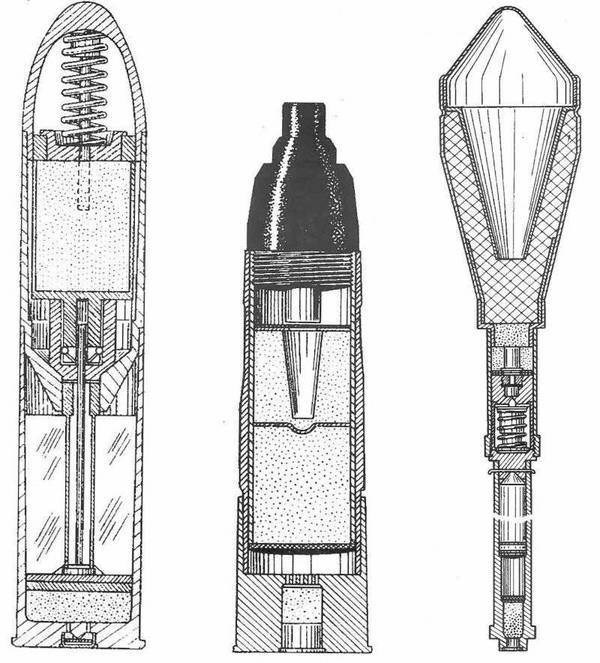 Оружие понравилось и получило развитие. Был разработан даже специальный вариант для борьбы с бронетехникой. Это была кумулятивная граната, которую называли Panzergranatpatronen (правая на картинке). Осколочная граната соответственно Sprengpatronen. Вот как они выглядели «изнутри»: