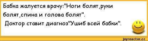 -Ну смотрите, вы сами попросили, значит так, доктор, у меня: спину ломит, рука ноет, нога хрустит, бок саднит, голова гудит, ухо стреляет, глаз дергается, челюсть сводит, в горле першит, лоб чешется, в носу хлюпает. Что мне делать доктор?