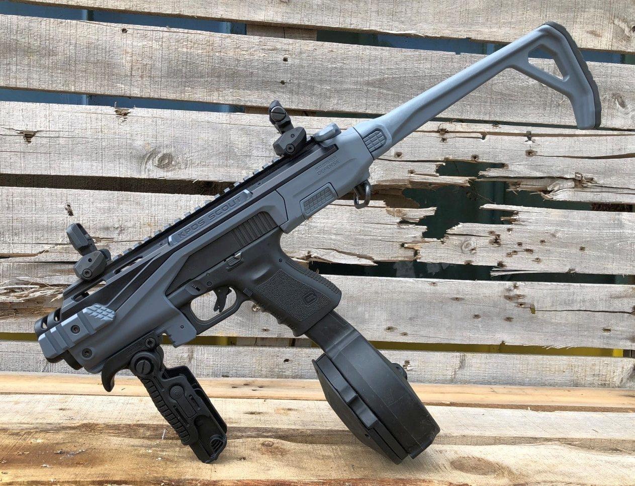 Но время шло, появились револьверы, а потом и унитарные патроны для тех револьверов. Стало немного понадёжнее. Но вот сильно точнее не стало. Ножики пытались навешивать и на револьверы, но с тем же успехом, поэтому редко. Вот именно в те времена к пистолетам в придачу стали предлагать съёмные приклады от ружей. Так стрелять было удобнее, а значит и точнее. Наверное, именно с этого момента можно начинать отсчёт появления пистолетных «обвесов». Сейчас это направление приобрело серьёзный размах. Вот посмотрите на это кошмарное чудовище: