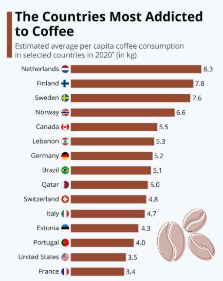 В списке самых активных потребителей кофе лидируют Нидерланды За ними следуют скандинавы: Финляндия, Швеция, Норвегия. Таких образом, скандинавов можно назвать самыми большими поклонниками кофе на планете!