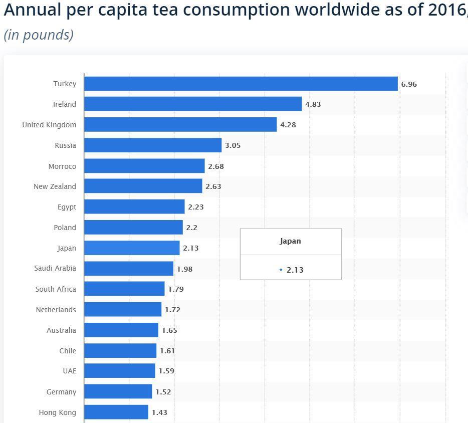 К первым можно отнести прежде всего Турцию, Ирландию, Великобританию, Россию, Марокко и Новую Зеландию. Причём в Турции потребляют чая на душу населения раза в полтора больше, чем в любой другой стране первой шестёрки!