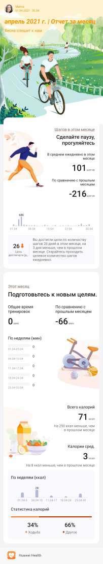 Поэтому я снова начала тихо ползать по квартире до кухни и туалета. И за апрель Хуавей прислал мне отчет, что я достигла дна цели за 26 дней, примерно 100 шагов в день наползалось, хотя в счет шло и то, что в постели телефон перекладывался слева направо, так что реально и того меньше. Но отчет очень красивый, там видно как как бы я как бы еду на велосипеде в погоне за парнем)) особенно интригует статистика калорий -  34% ходьбы и 66% другого, а я точно знаю "другого" у меня в апреле не было и в этом году не было и в том) Интересно какая в мае будет статистика) мне понравилась программка, мотивирующая такая.