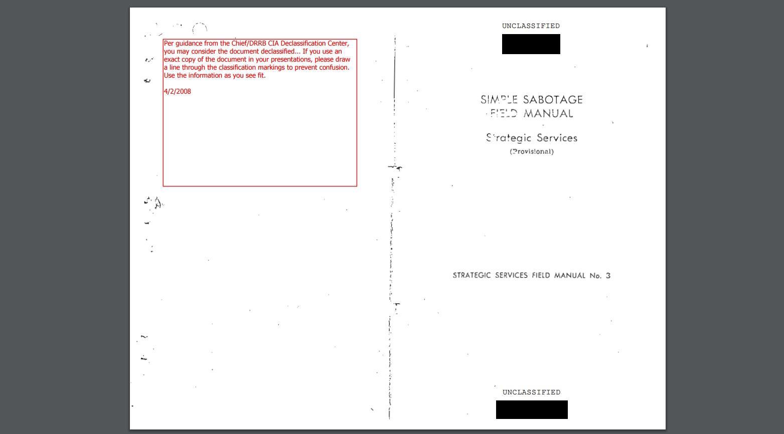 Рассекреченная в 2008 году и доступная сегодня на сайте ЦРУ, эта брошюра предназначалась обычным людям, которые хотели, но не знали как ослабить нацистскую Германию в годы Второй Мировой. В инструкции рассказывается о том, как можно саботировать производство на заводах, в офисах и на транспортных линиях.