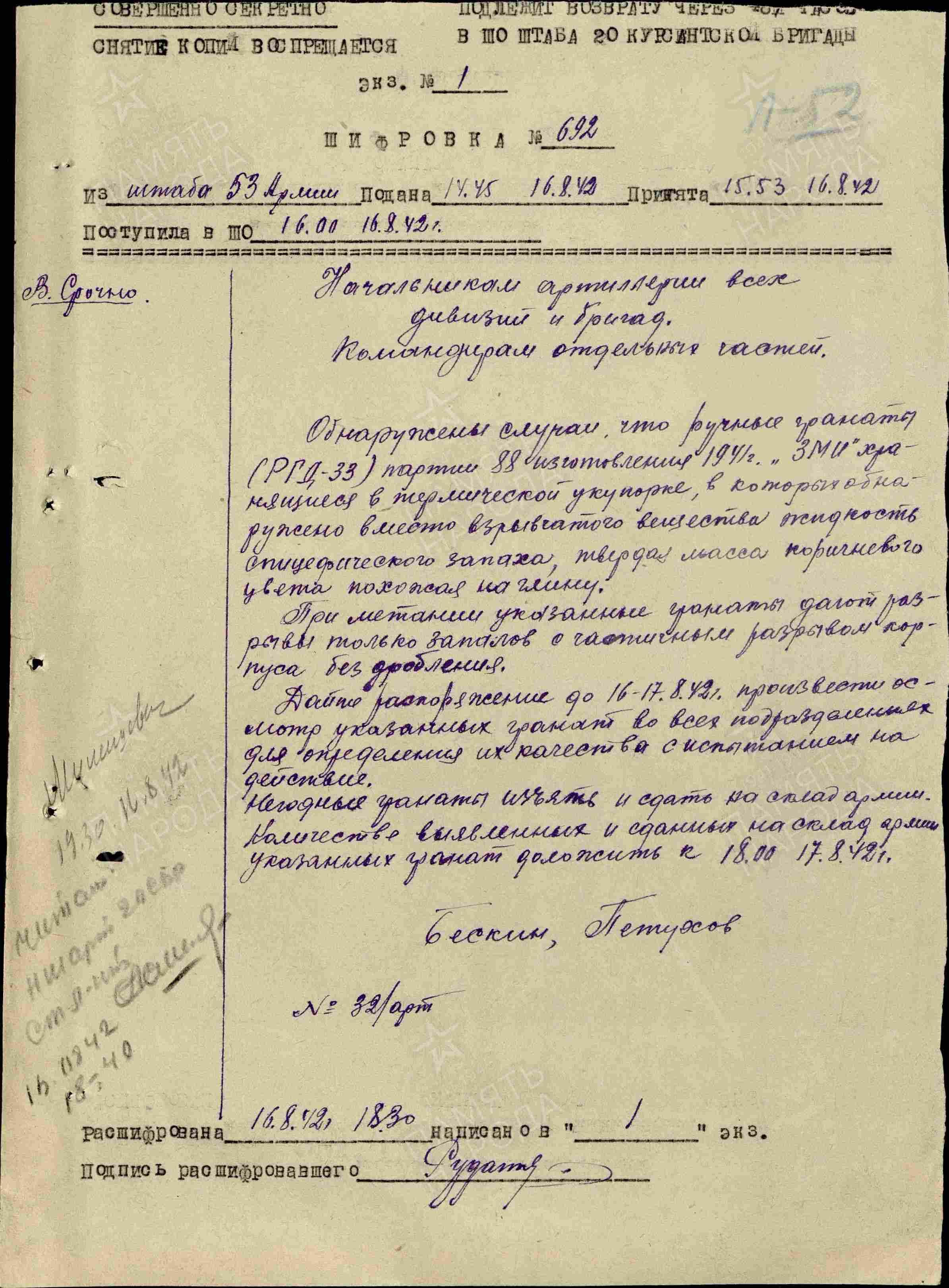 Автор: Андрей УлановКогда-то давным-давно в "этих ваших энторнетах" был рассказ про находчивых рабочих, во время ВОВ скоммуниздивших взрывчатую начинку бомбы, а чтобы приемка не определила недовес, заполнивших фугаску, гм, продуктом жизнедеятельности со специфическим запахом. Тут, конечно, в ручные гранаты вряд ли то же самое начинили, но описание заставляет насторожиться.