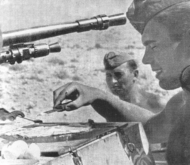 Экипаж танка Т-2 из корпуса Роммеля готовит яичницу на завтрак. Костер не нужен, спиртовка не нужна - танк так раскален солнцем, что яичница мигом готова. Да, не забыть посолить и поперчить.