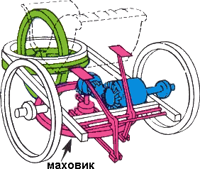 Слуга сзади стоял на педалях - таким образом давя на них всем весом, что значительно увеличивало его силу. Педали раскручивали маховик - таким образов маховик запасал энергию. А вот уже от маховика вращение передавалось на колёса. И передавалось оно через 3-ступенчатую коробку передач! Не хуже чем у многих ранних авто. Да и по скорости коляска Кулибина не сильно тем ранним авто уступала.