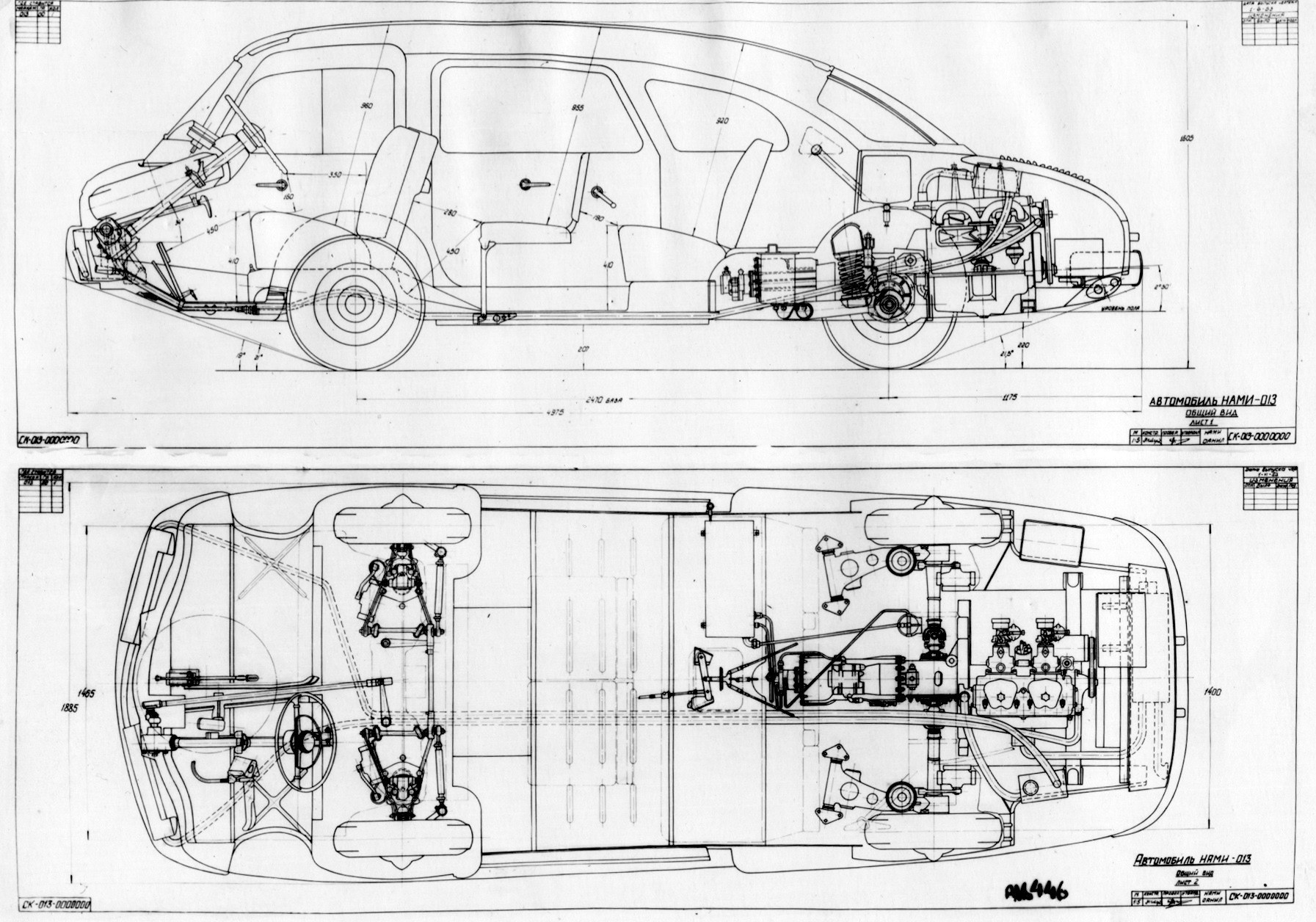 Про Долматовского хочется добавить ещё немного, хоть и не по теме. Его любимая вагонная компоновка была применена не только на миниавтомобиле "Белка". Вот это он предлагал делать на базе всем известной "Победы". Здесь применили автоматическую коробку передач и гидравлику (1946 год). Обратите внимание - в серединке добавлены дополнительные места. Вот схемка: