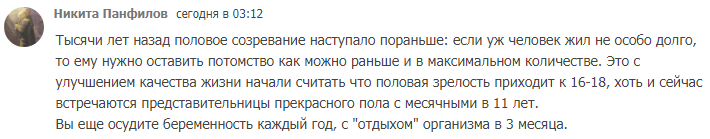 Теперь вопрос к Никите и прочим педобирам: как вы собираетесь определить, кроме как опытным путем, что девочка может родить ребенка без негативных последствий? В принципе, известны случаи самостоятельных родов, которые пережила и малолетняя мать и ребенок при возрасте матери в 9-10 лет. При этом есть множество задокументированных случаев, когда девушки из благородных фамилий (то есть те, кто неплохо питались и не были лишены медицинской помощи, пусть и примитивной) погибали рожая первенцев в 13-15 лет.