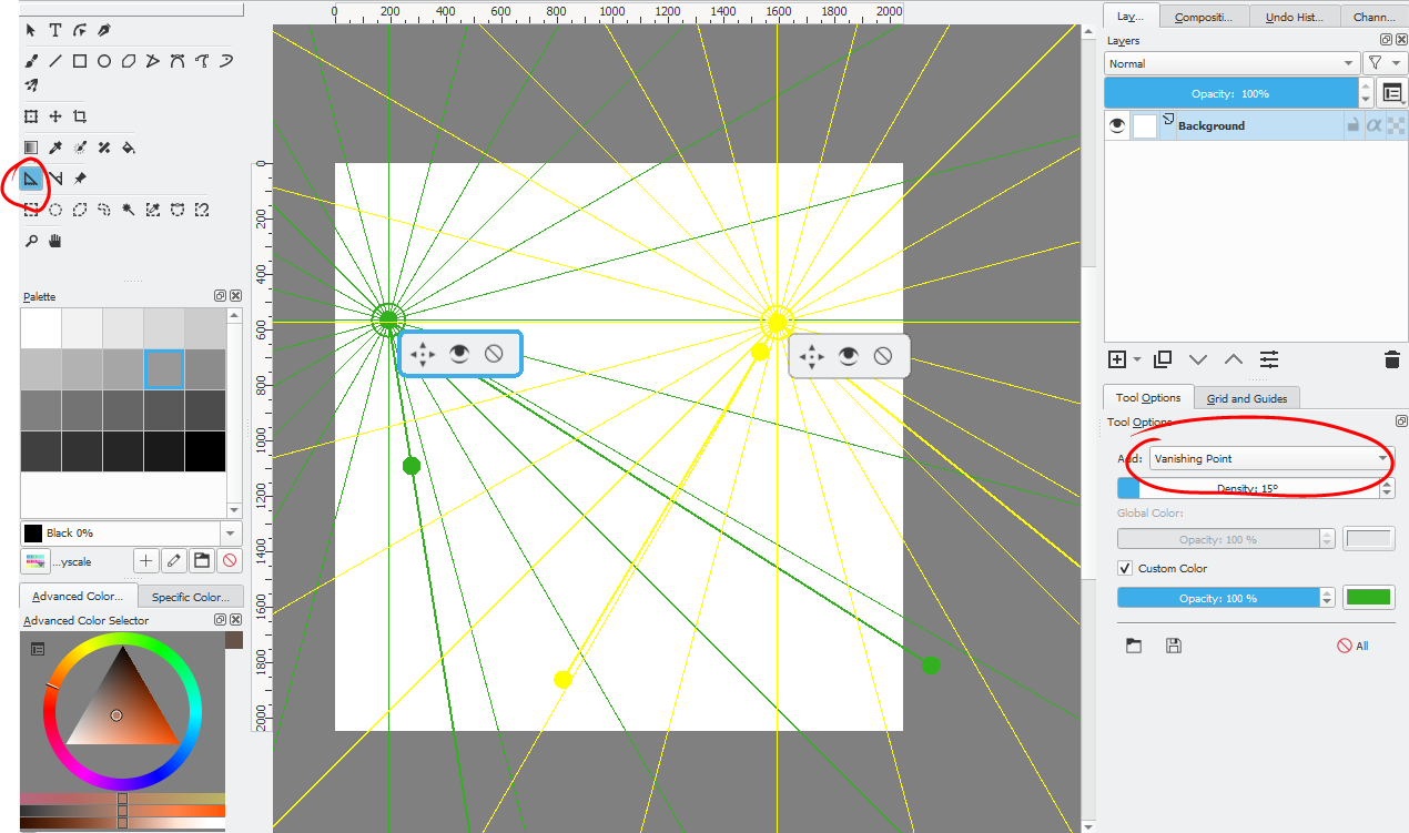 Vanishing point представляет собой точку схождения и два управляющих "луча" с контрольными точками, при помощи которых можно всё это передвигать. Плодить их можно сколько угодно, я ещё люблю для ясности раскрашивать в разные цвета (по умолчании все серые, можно менять цвет всем разом, или каждому по-отдельности). Главное, чтобы в пределах одного рисунка точки схождения располагались на одной и той же линии горизонта. То же самое можно повторить вручную, но инструмент ценен тем, что точка схождения может уйти за пределы холста - ну и изменить всё можно мгновенно, в отличие от прочерченных линий. К тому же в режиме кисти он строит дополнительные линии от текущего местоположения курсора к точке схожения.