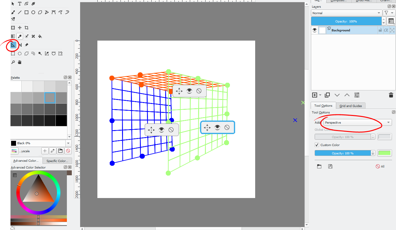 Теперь перейдём непосредственно к Крите. У неё есть набор шикарных вспомогательных инструментов, конкретно для перспективы это Vanishing point и Persperctive. Вот так оно выглядит.