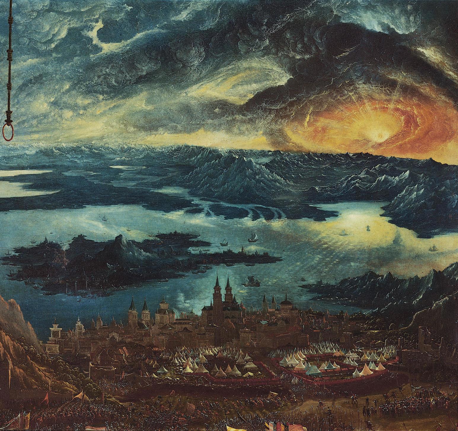 В "Победе Карла" тоже дается взгляд сверху. Главный персонаж изображен в золотых тонах. И... небо. День и ночь одновременно, словно Альтдорфер желал показать Вселенную, которую скрывает от нас атмосфера. Вот как, как ему пришло это в голову?!