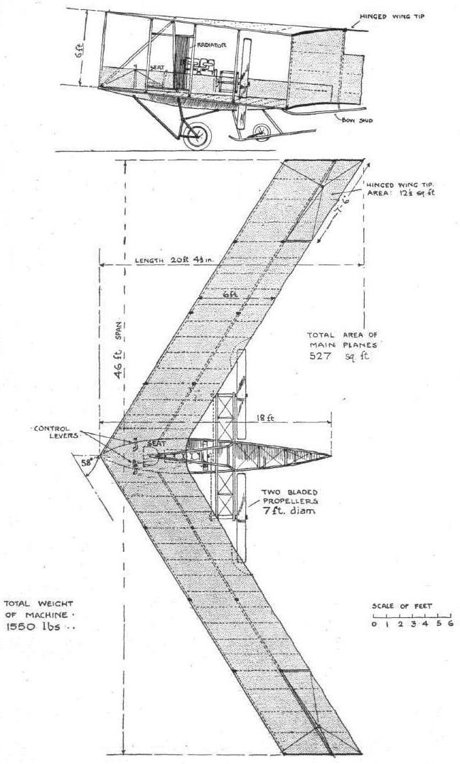 Это я решил вот так плавно перейти к другим формам крыльев, а то что-то всё про кольцепланы да про кольцепланы… были ведь и другие крылья у людей. Вот, например, все привыкли, что у реактивных самолётов крылья отклонены назад и по-другому особенно никто и не мыслит, потому как для того, чтобы быстро летать по-другому просто никак. И говорят, что так началось, когда стали использовать турбореактивные двигатели. А вот и нет. Началось всё это значительно раньше – аж в 1910 году в Англии, когда лейтенант Джон Данн (J. W. Dunne) сделал свой D.5 и… короче он летал и выглядел вот так: