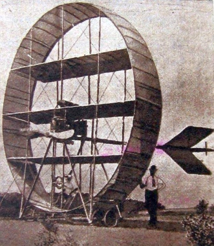 Думаете, что одни французы были такими странными? Отнюдь. Американская научная мысль отличалась не меньшей лихостью и провалы коллег их не останавливали. Один из них точно не остановился. Парня звали Уильям Пирс Гэри и в 1910 году его угораздило построить штуковину, названную им в честь себя-любимого Gary-Plane. Оцените высоту мысли (для тех, у кого плохо с глазомером уточню – высота (диаметр) штуковины около 8 метров):