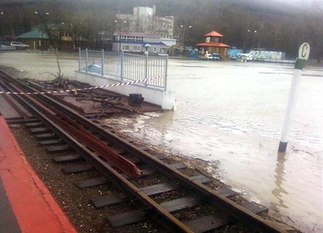 Этакое локальное наводнение. Оно началось в пять утра, а мы были в парке в тот же день около обеда. Кое-где было подтоплено и грязно, полотно железной дороги размыто, а в городе вода утекла в низину, попутно растекаясь по лужам и канализационным люкам. К чести работников парка они отлично справились с наводнением в считанные дни, и к празднованию 9 мая подготовили парк для встречи с ветеранами.