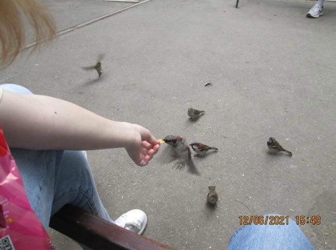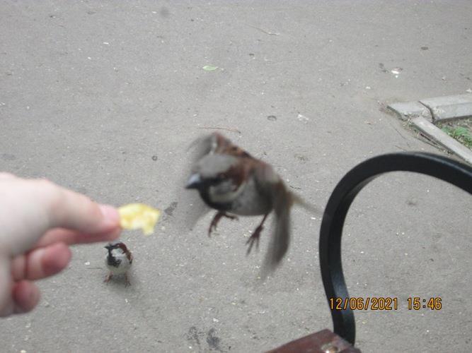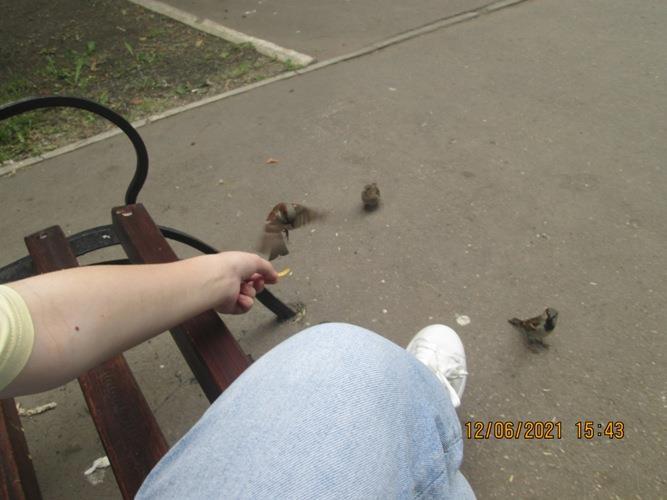 На этом наша прогулка по шопинг-центру закончилась, и мы отправились в аллейку поблизости. Потом прогулялись по рынку, купили чипсов и снова вернулись на скамейки. Было жарко и нас дико разморило. Хотелось спать. К нам стали приставать птицы, выпрашивая крошек. Сначала мы не обращали на них внимания, пока я не предложила дочери их покормить. В итоге она «заставила» наглых воробьев выхватывать кусочки чипсов прямо из ее руки. И тут мы настолько увлеклись процессом — дочь кормежкой, а я съемкой этого дела, — что напрочь позабыли о времени! Кормить птиц из рук оказалось в сто раз интереснее, чем ходить по магазинам и примерять вещи, кормить рыбок и фотографировать цветы)))