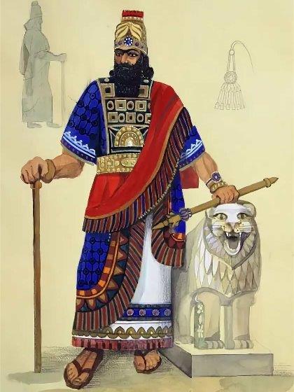 Из-за длинного плаща цвета выцветшей зелени выглядывал пурпурный конас расшитый цветной нитью, из-под которой виднелась прикрывавшая икры ног канди из тонкой белой шерстяной ткани, украшенная вышивкой с геометрическими рисунками. Обе детали одеяния заканчивались пурпурной бахромой. Бахрома канди доходила до кожаных сандалий. Запястья царя украшали золотые браслеты, на пальцах красовались перстни с аметистом и рубинами, еще по одному браслету в форме незамкнутого обруча расположились выше локтя на каждой руке. Голову правителя Ассирии венчал кидарис.