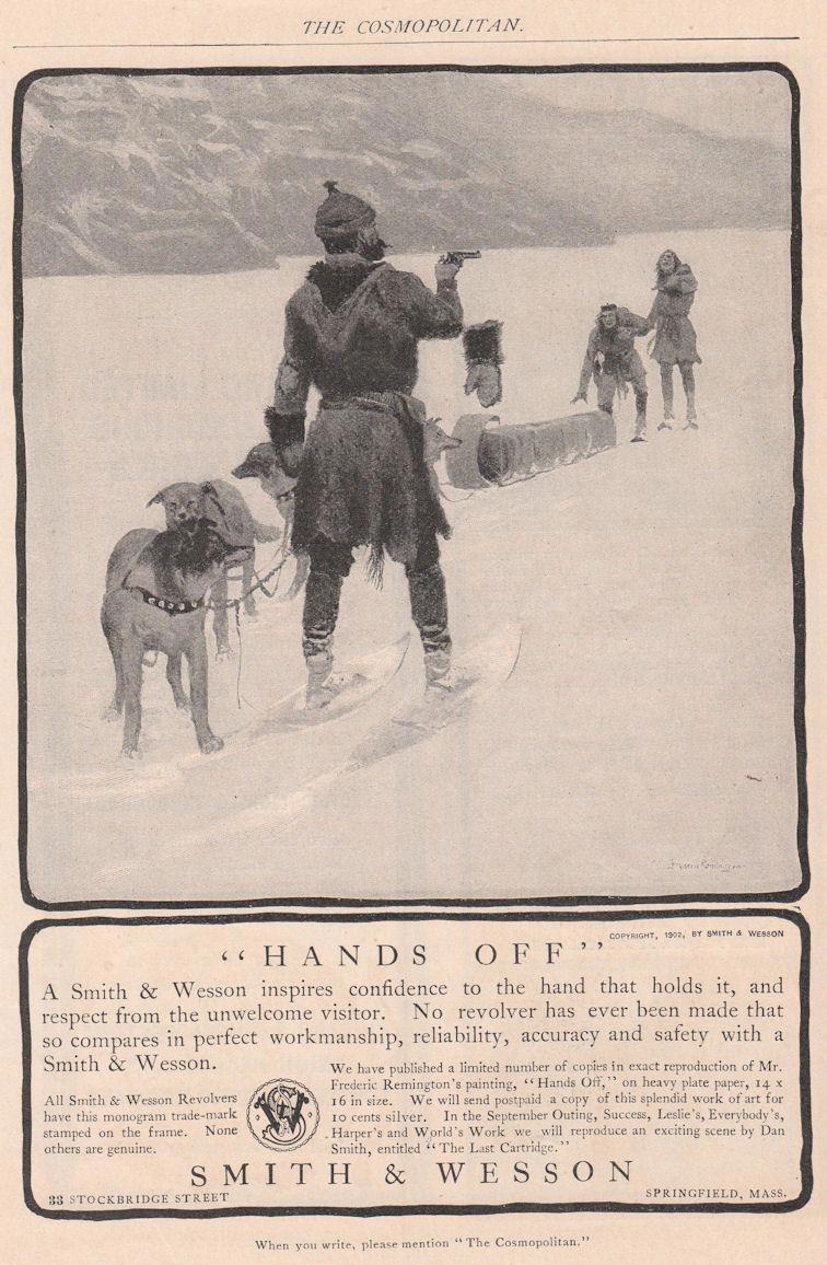 Автор: Андрей УлановДавным-давно, когда еще не придумали компьютерную графику, чтобы заманивать покупателя в оружейку чудным зрелищем вылетающего при выстреле из ствола совершенного целого патрона, уважающие себя оружейные фирмы заказывали у известных художников картины для рекламы своей продукции. В частности, в начале 20-ого века фирма "Смит-Вессон" заказала несколько картин у Фредерика Ремингтона – к слову, родственника Элифалета Ремингтона, основателя компании Remington Arms Company.