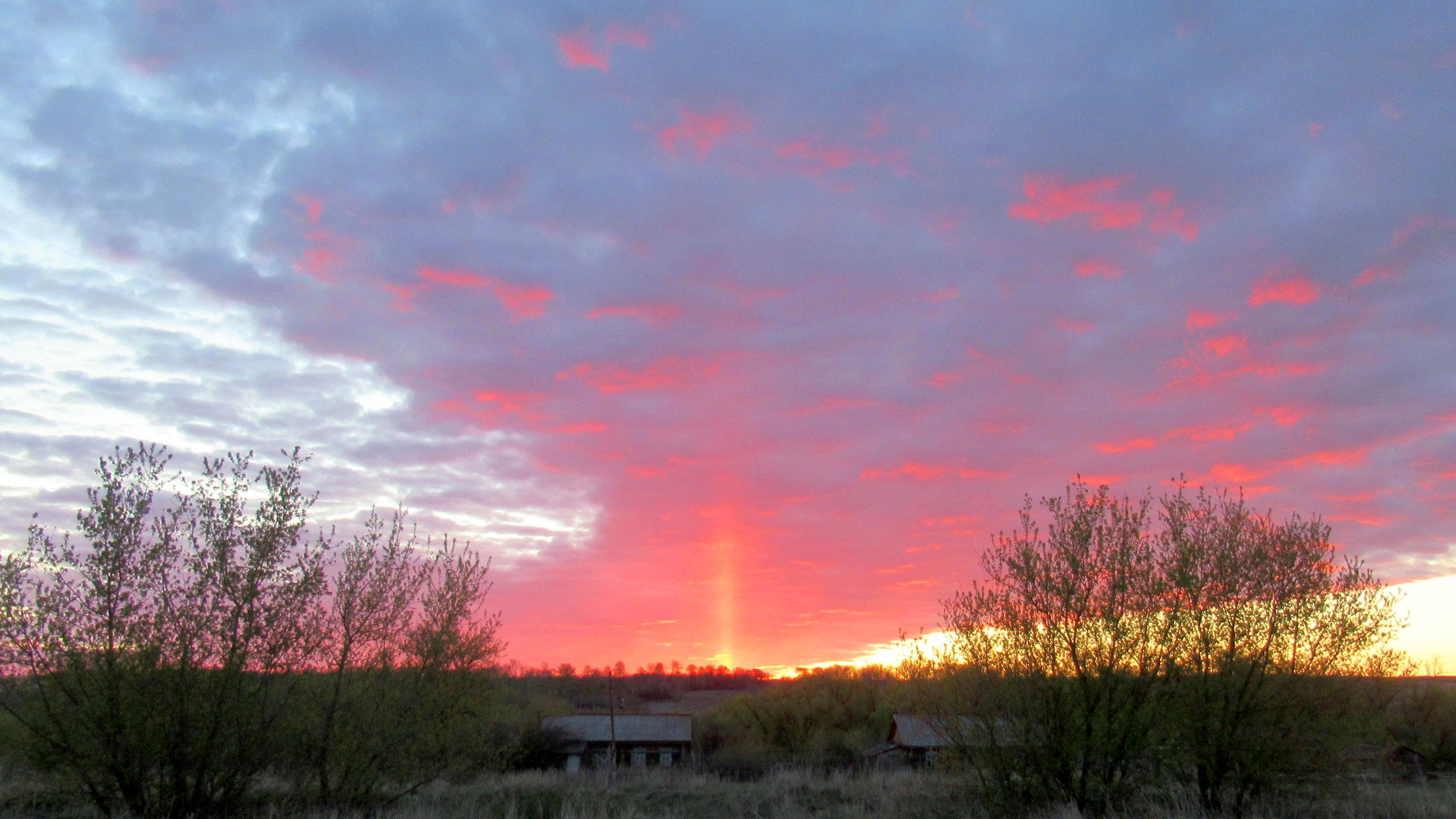 Третье место занял уникальный рассвет. Удалось ухватить редкий вид, когда первый луч столбом поднимается над землёй. Деревня, апрель, 4 утра.