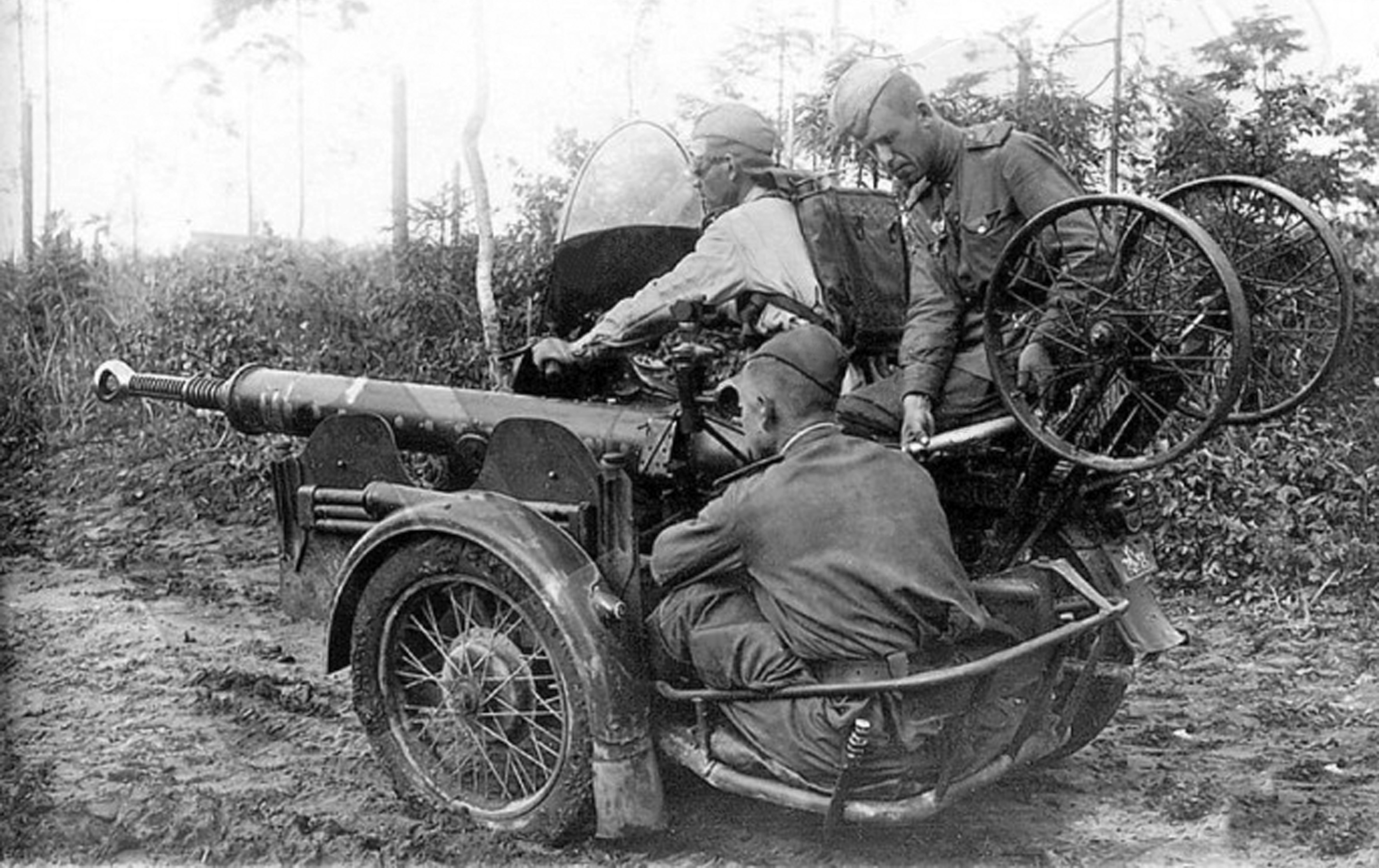 Разумеется пулемётами и автоматами дело не ограничивалось. Огневую мощь мотоциклистов всё время пытались повысить. Вот здесь на него установили противотанковое ружьё Дегтярёва ПТРД:
