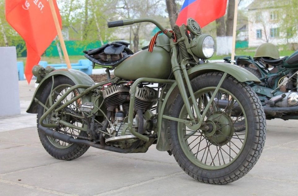 А ещё начиная с 42 года стали появляться американские мотоциклы. Вот такой "Харлей", например: