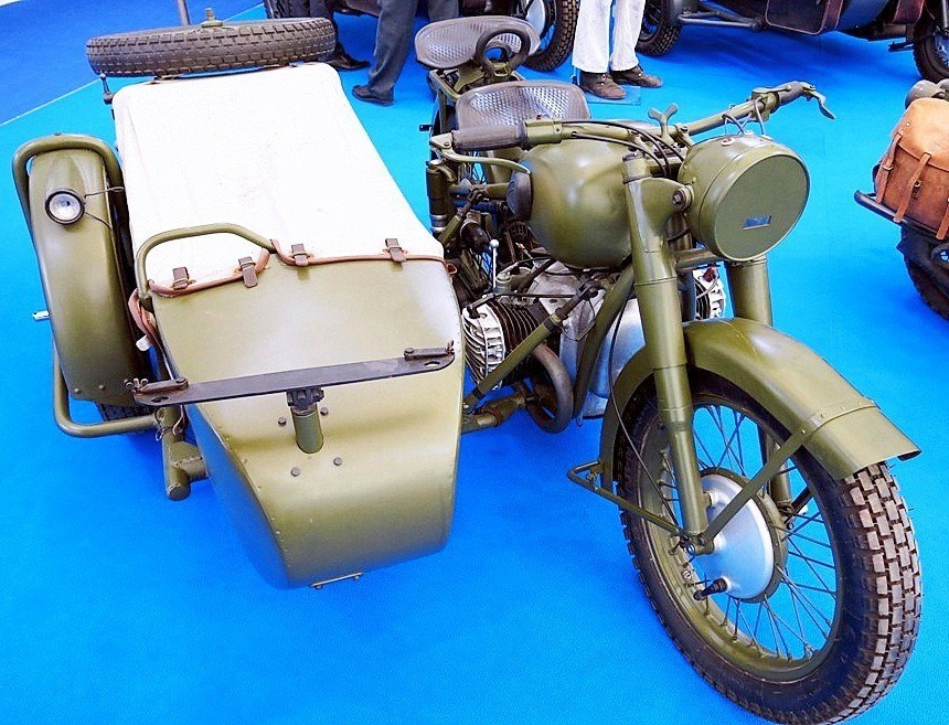 У немцев кроме потерь чисто боевых возникали также проблемы с проходимостью по бездорожью и они разрабатывали мотоциклы с пониженными передачами и с приводом не только на заднее колесо, но и на колесо коляски. У нас также были проведены подобные работы. Их результатом стала вот такая модель ТМЗ-53 (здесь ещё и колёса пошире сделали):