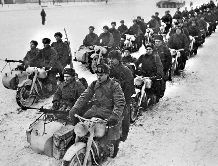 К 1942 году немецкие мотоциклетные части понесли очень тяжёлые потери. Может по этой причине, а может и потому, что немцы стали вести в основном оборонительные бои, но оставшиеся мотоциклетные батальоны у них были расформированы. Мотоциклетные части (в основном роты) остались только в танковых и моторизованных частях в качестве разведподразделений. У нас же всё только начиналось. В 1942 году фронту было передано 7430 мотоциклов. Далее количество только нарастало. Всего же в Красной Армии воевал 41 мотоциклетный полк, шесть из которых стали гвардейскими.