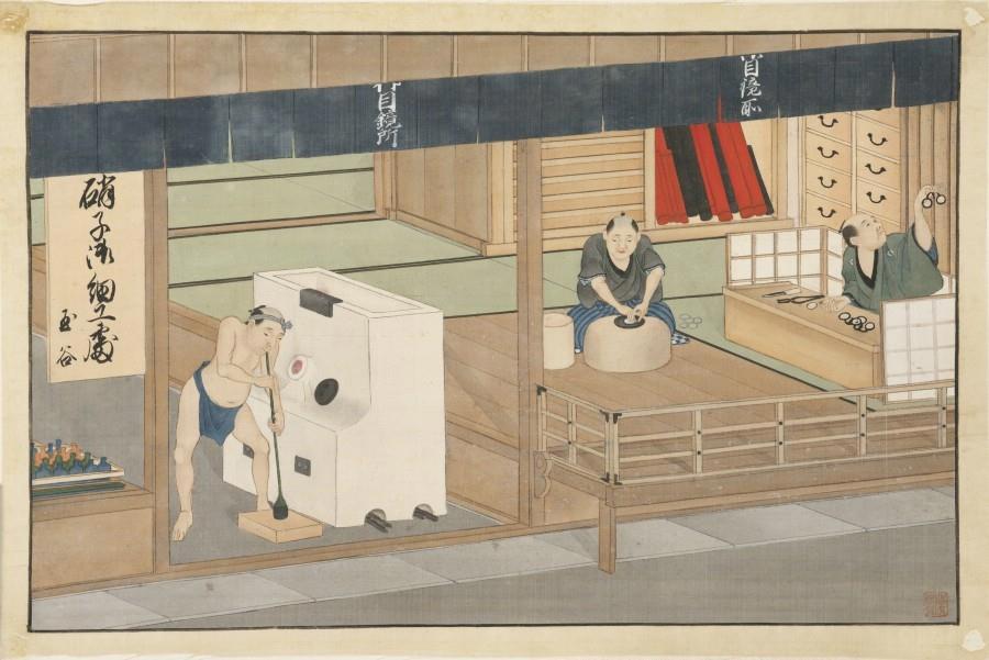 Слева на рисунке изображён стеклодув. Стоя у печи, в которой горный хрусталь плавится в кварцевое стекло, он выдувает заготовку линзы. Мастер в центре шлифует её, а человек справа вставляет готовые линзы в оправы.  Японцы добились высочайшего уровня обработки линз, которые, по словам иностранных очевидцев, были сравнимы с лучшими европейскими, а часто и превосходили их по качеству. Оправы вырезали из китового уса, бычьего рога, панциря черепахи, то есть наиболее лёгких и в то же время достаточно прочных материалов.