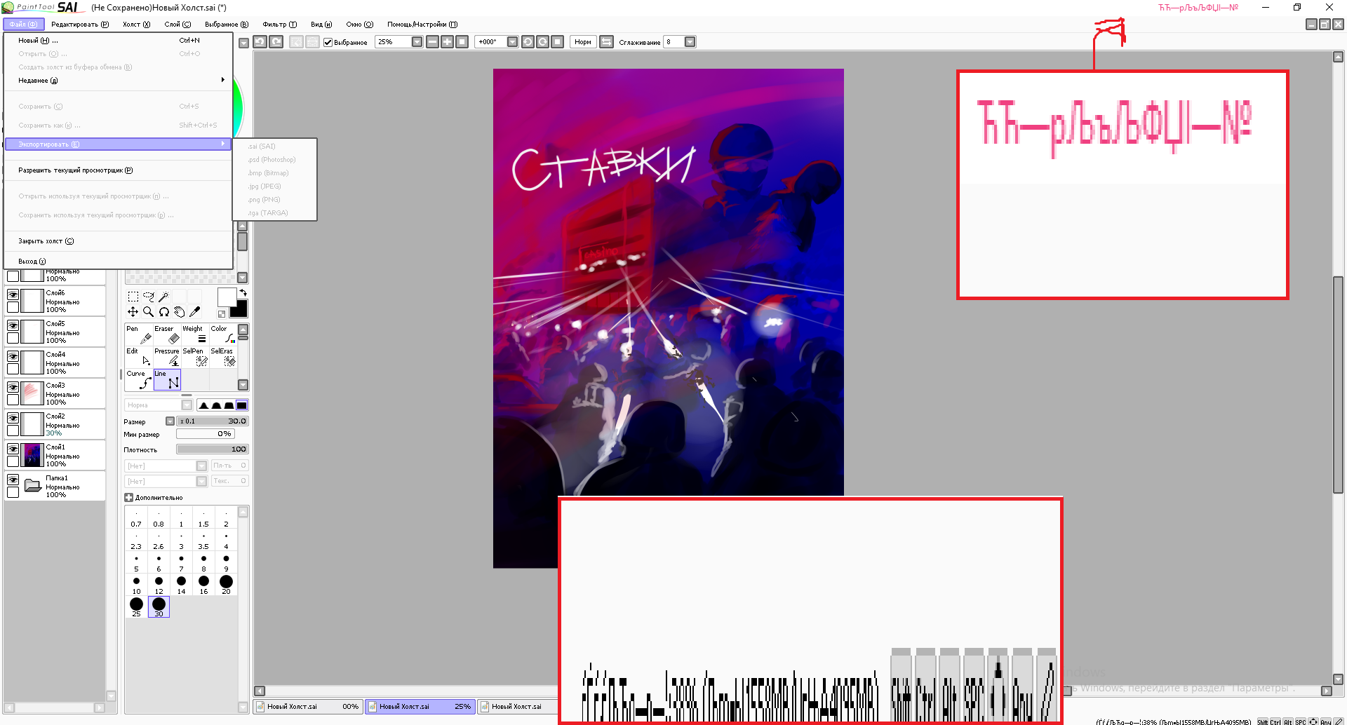 А теперь поясню: произошла ошибка. Название холста изменилось на то, что вы видите на изображении сверху. Сохранить не могу, экспортировать тоже: кнопки просто-напросто заблокировались!