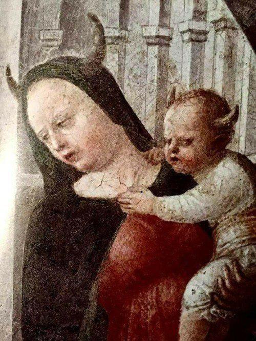 🔹️На стенах Капеллы Портинари в Италии находится удивительная картина - рогатой Богоматери с рогатым младенцем на руках. Какой-нибудь особо увлекшийся гид даже может поведать вам, что автор картины - сатанист, но чаще всего ее репродукцию и иллюстрации в Сети принимают за фейк. Однако, ни то, ни другое: там точно есть рога, а автор картины  - Винченцо Фоппа -  писал  в рамках канона РКЦ эпохи Возрождения (фреска конца 15 в).