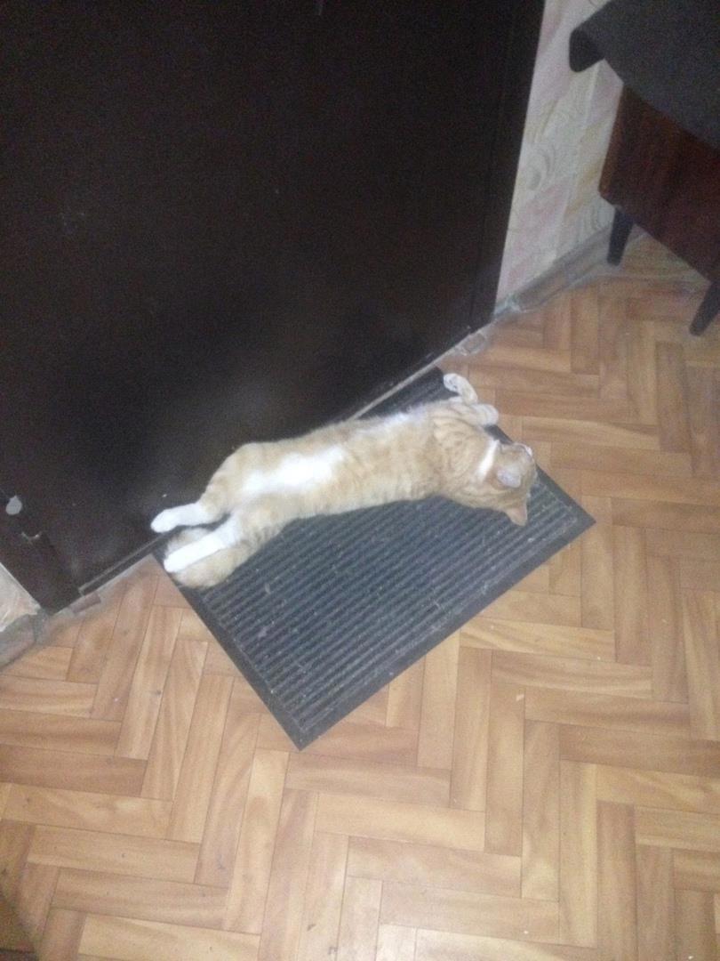 Со стороны похоже, что сдох. На самом же деле прикидывается шлангом. Стоит только сказать, идём жрать, как первым бежит к холодильнику.