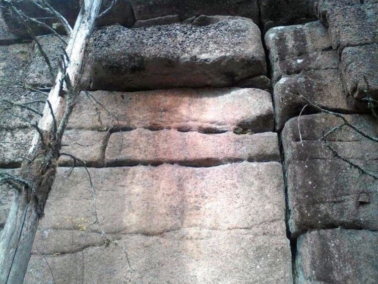А ещё имеется информация о том, что в камнях-то этих, точнее в этих здоровенных блоках, имеются сквозные отверстия. Даже фотки показывают и добавляют, что через отверстия эти пропущены металлические стержни, на которых вся эта кладка до сих пор спокойно стоит и не шатается. Даже вот такую фотку показывают...