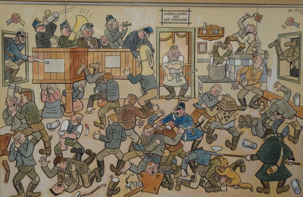 Танцам - конец, девки с бабами удрали, кроме самых нерасторопных, оркестр несет потери и яростно исполняет музыку, уже вступив в бой, мальчишки на печке ведут свою маленькую детскую войну с применением кофемолки (и кстати наглядно - попадая в котел!), взрослые мужи яростно бьются уже во всем трактире. С улицы прибежал будочник теперь и с алебардой, в окно лезет пожарный - разливать друзей водой и трактирщик грозно вышел на тропу войны.