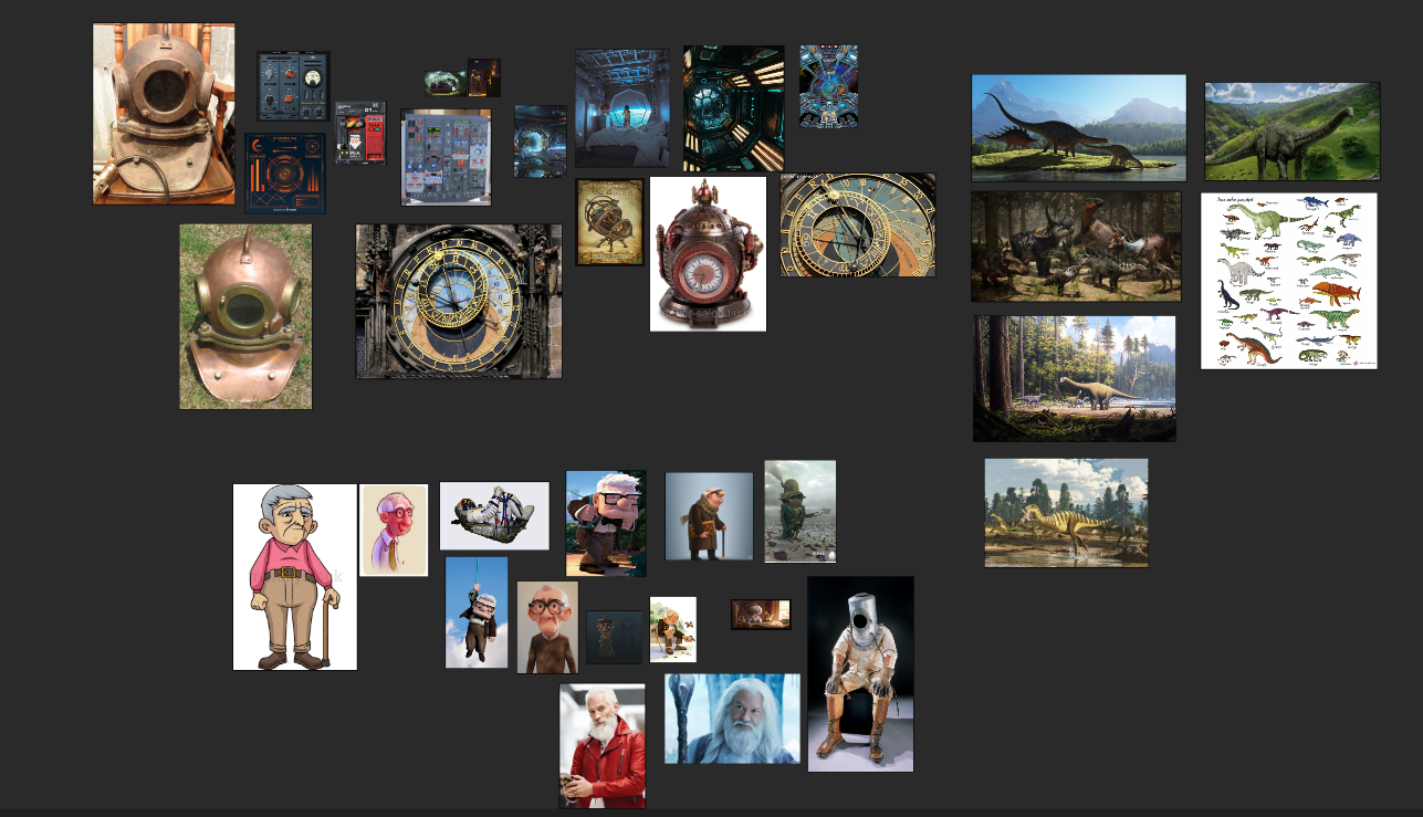Начинаем нашу работу с выбора референсов. Я хочу показать на рисунке несколько вещей: во-первых, игрушечных динозавров, во-вторых, игрушечную машину времени и, в-третьих, - игрушечного старика. Не очень люблю реализм, поэтому будем отходить от него максимально далеко.