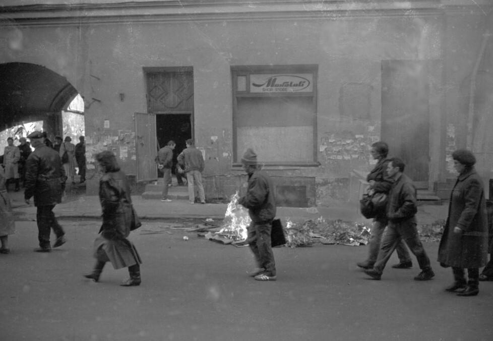 Автор фото (А. Крутов) было сделано на улице Рождественка, около арки, ведущей к станции метро «Кузнецкий мост». На нем изображена толпа прохожих людей, горящая рядом с ними куча мусора, а на заднем плане видны стены в бумажных объявлениях и дверь в магазин, окно которого закрыто фанерой.