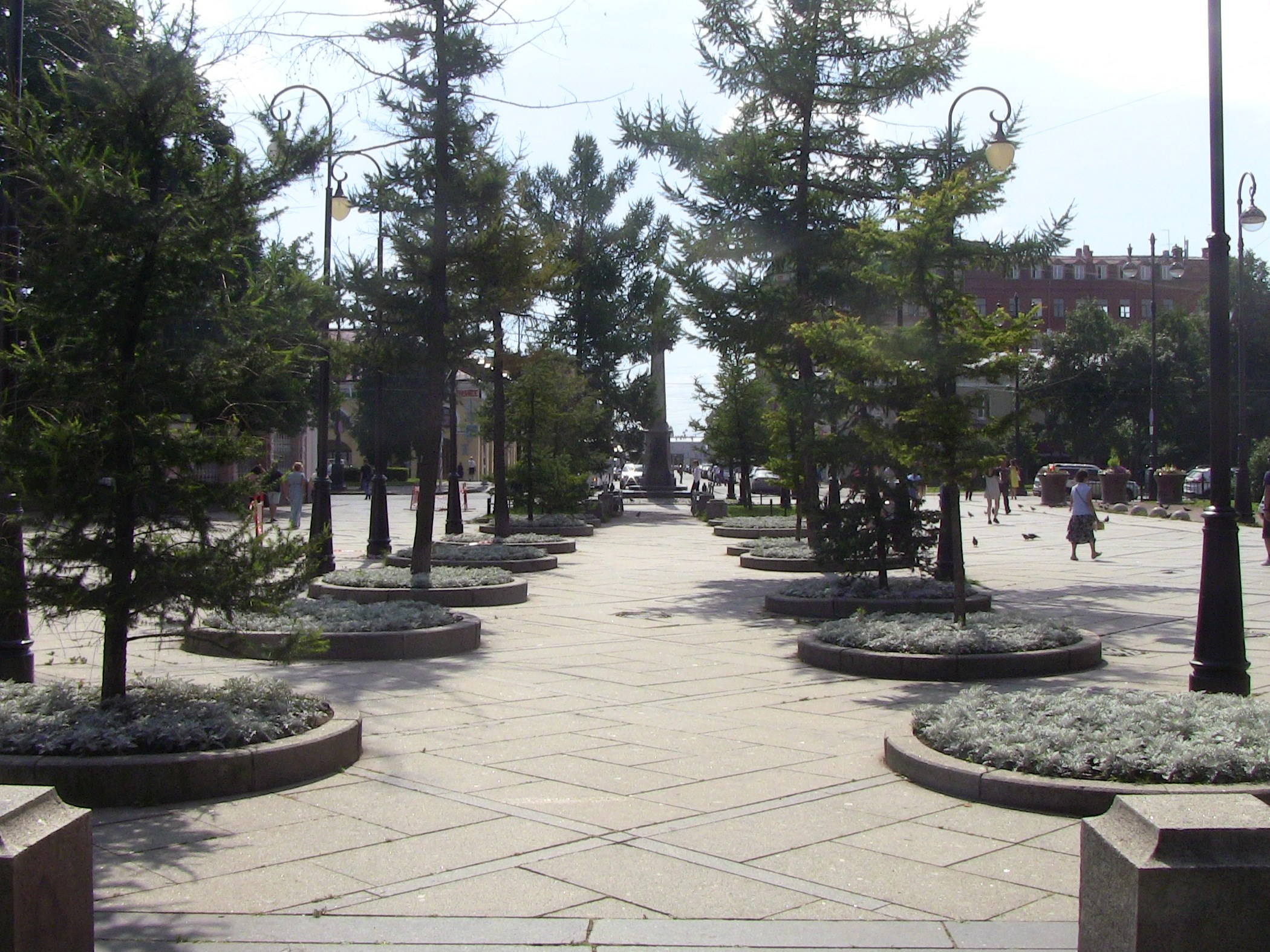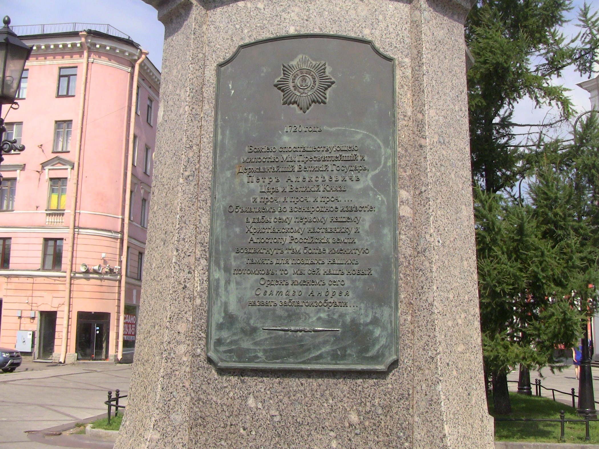 В конце виден памятник в честь Андреевского ордена. Св. Андрей был покровителем русских моряков, Андреевский флаг - белое полотнище с двумя синими лентами по диагоналям, поднимали во время сражения.