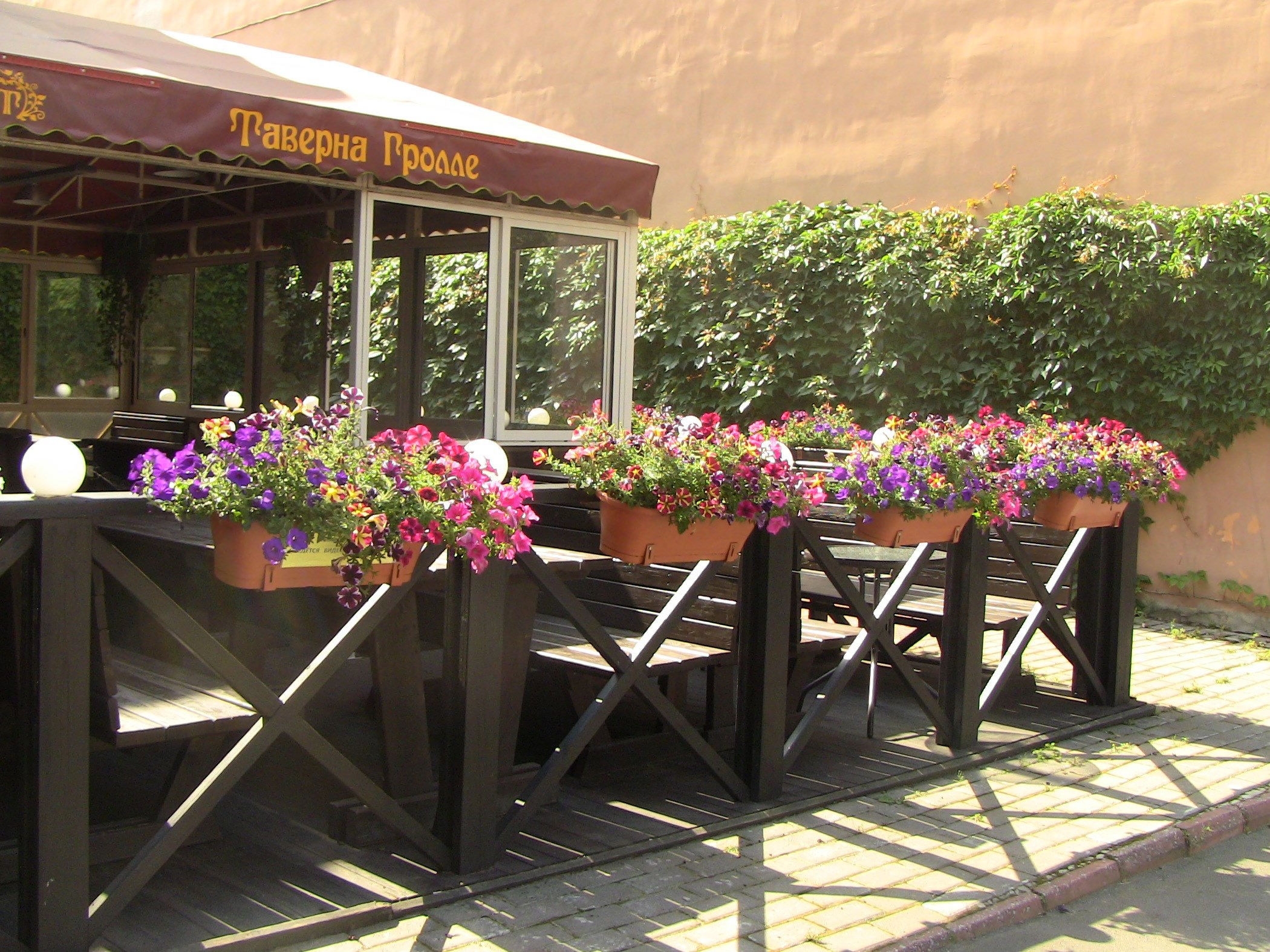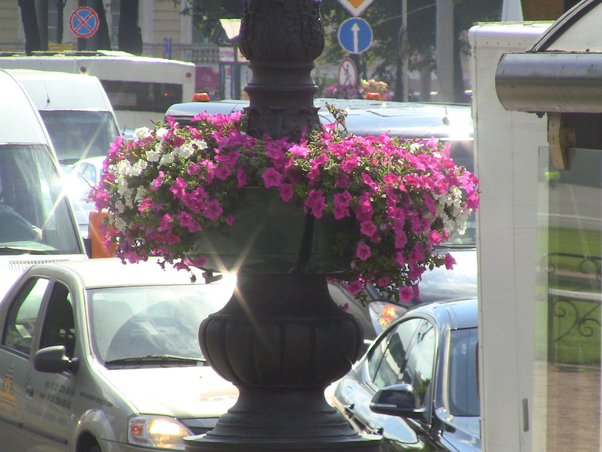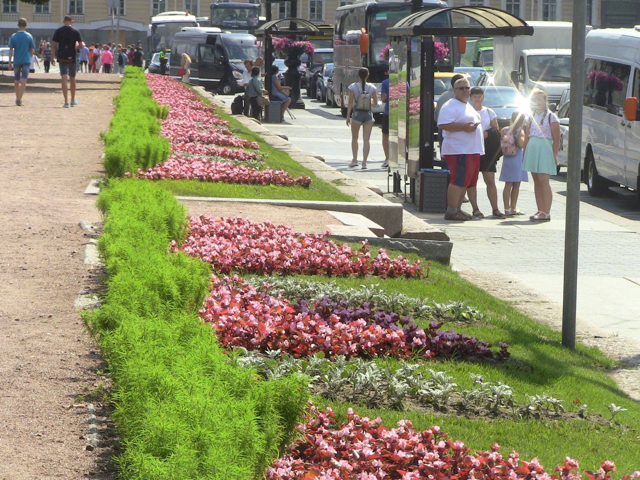 На Ваське, как и по всему городу полно всяких цветочных клумб, в основном временных, которые увозят на зиму (север все таки), зато летом цветов полно. Здесь мы повернули направо, до Невы тут всего два квартала.