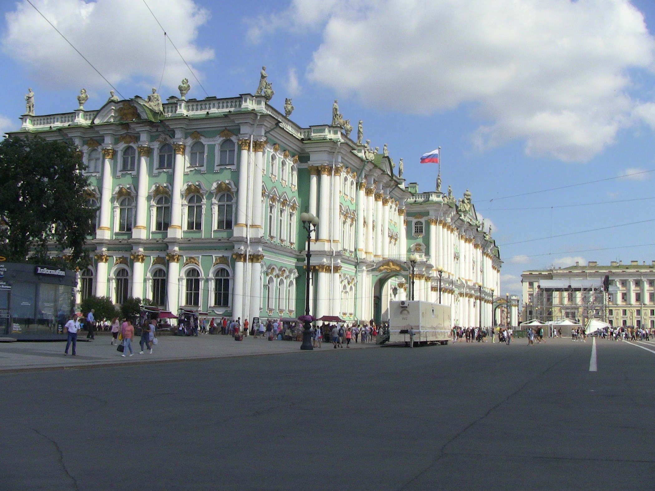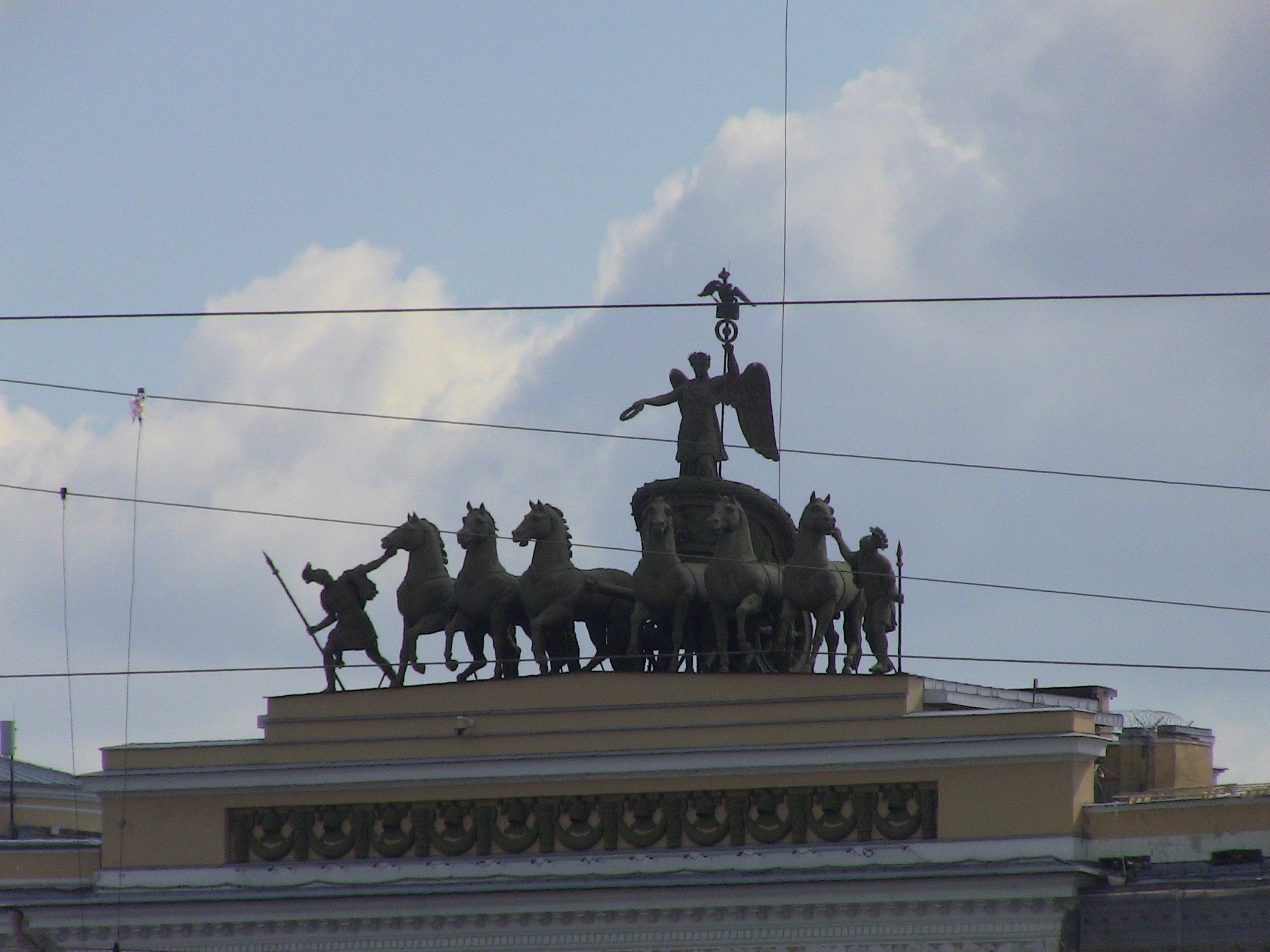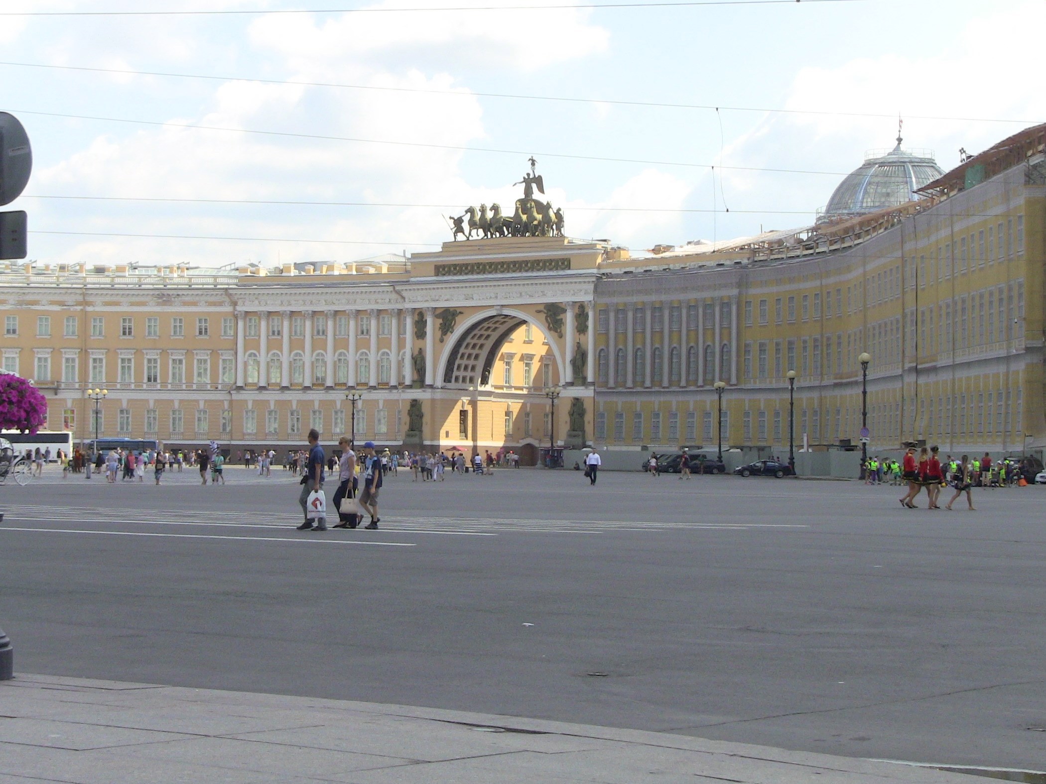 Это здание генерального штаба с знаменитой римской колесницей на арке. Ген штаб расположен в правой части Сенатской площади, напротив Зимнего дворца, который теперь часть Эрмитажа. Чтобы попасть в него на осмотр и успеть хоть немного погулять и осмотреться, приходится даже в будний день вставать в 6 утра и отстояв очередь за билетами (пенсионерам и проч. скидки, но только с документом) попасть внутрь часов в 9, в лучшем случае в 8. Все дополнительные заллы, самые красивые и интересные с доплатой, как и право на фотосъемку.
