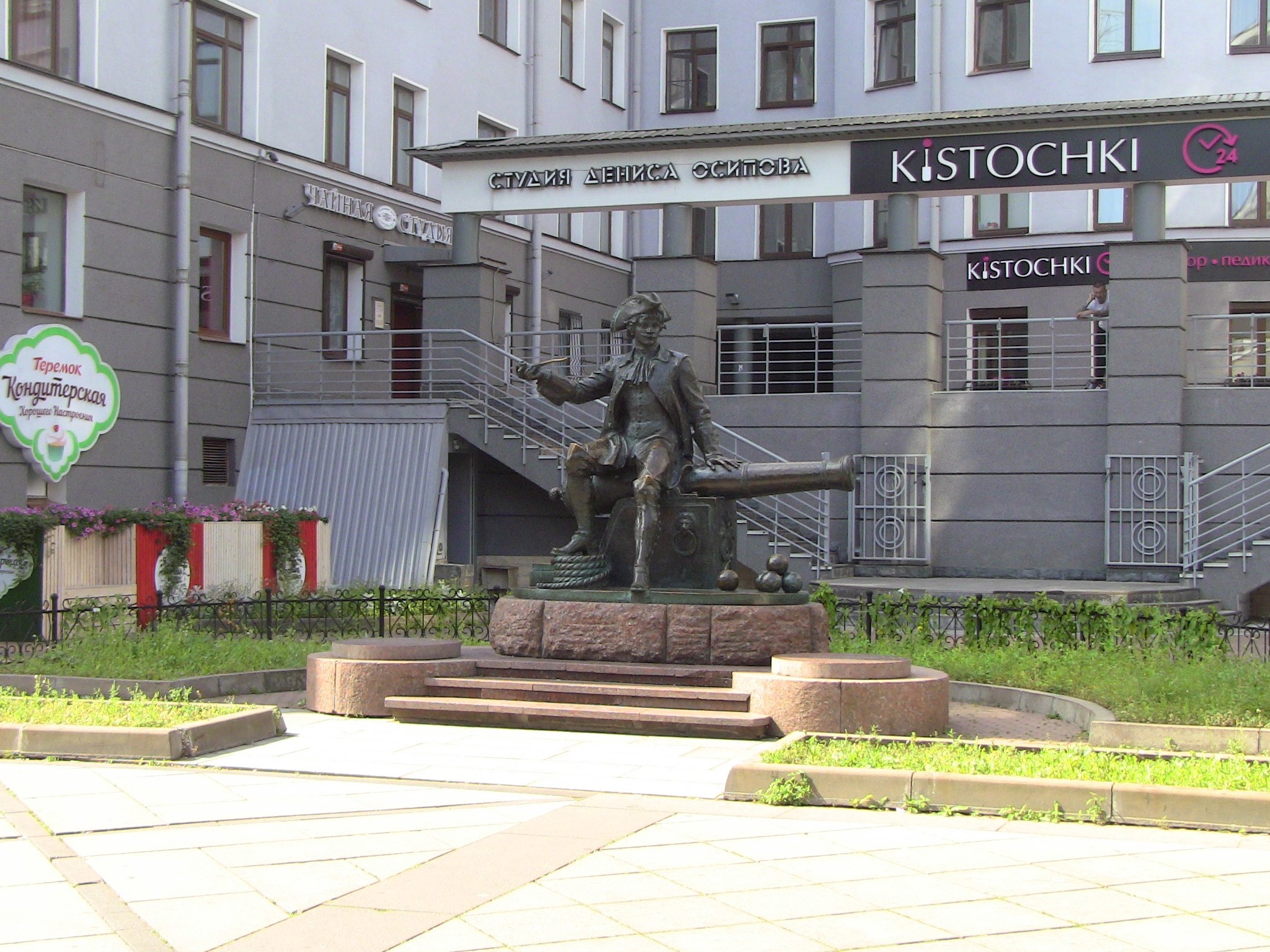 Вот такой памятник, к сожалению без подписи, но судя по морде лица, это молодой Петр, стоит на 7-й линии. Он находится совсем недалеко от метро, стоит только выйдя поворотить направо.